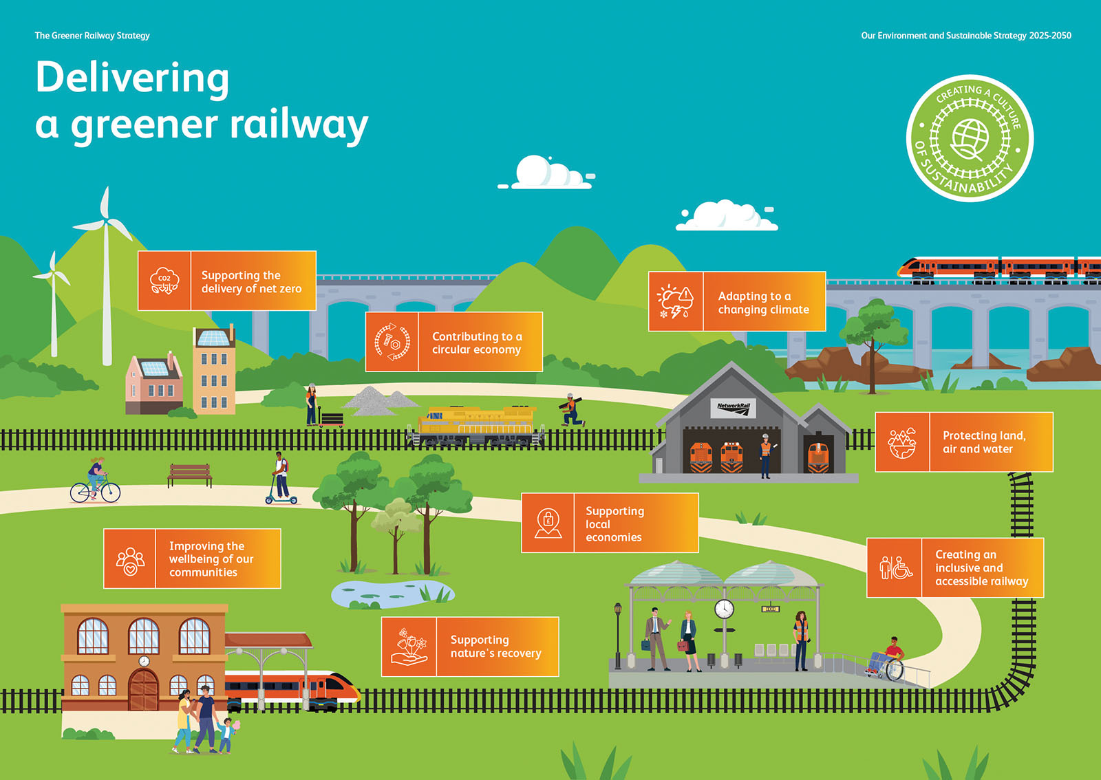 Our interactive graphic shows our eight priority areas for delivering a greener railway. Click the priority area buttons to discover relevant case studies. Case studies may relate to multiple priority areas.